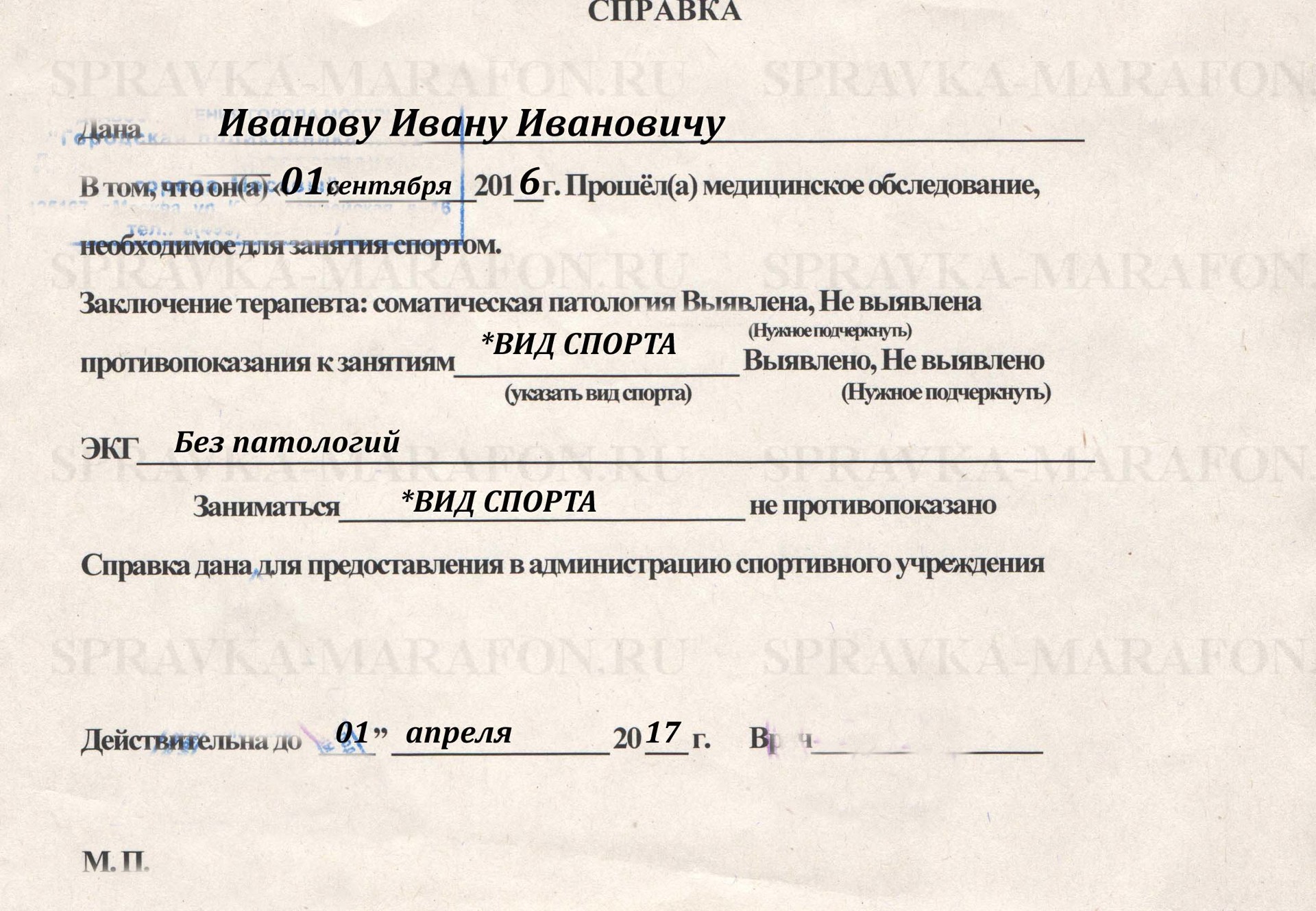 Мы просто выдаем вам медицинскую справку для спорта, не проводя никаких обследований. И все возможные последствия – под вашу ответственность. Да и тренер может увидеть симптомы заболевания и не допустить к тренировке. Поэтому сразу предупреждаем, что даже если у вас на руках свежая справка для спорта, но явные признаки острой патологии, она ничего не решит.